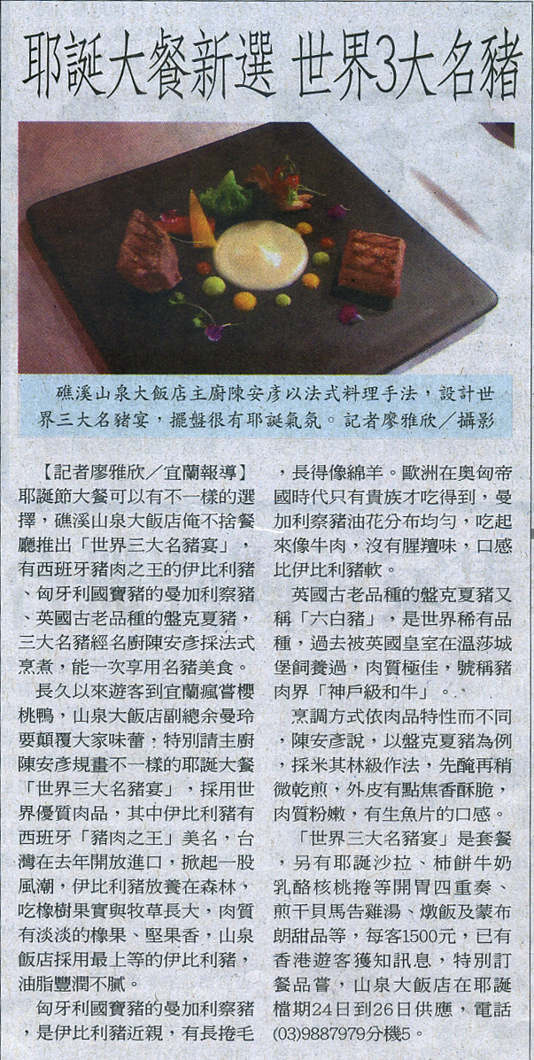 「世界三大名豬宴」是套餐,另有耶誕沙拉、柿餅牛奶乳酪核桃捲等開胃四重奏、煎干貝馬告雞湯、燉飯及蒙布朗甜品等,每客1500元,已有香港遊客獲知訊息,特別訂餐品嘗,山泉大飯店在耶誕檔期24日到26日供應,電話 (03)9887979分機5。